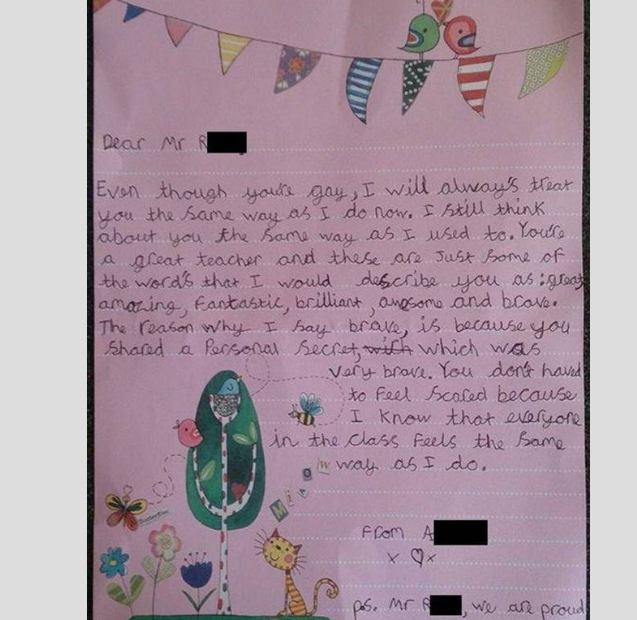 The teacher who received the letter told the website that as a primary school teacher, “I’d always worried about mentioning my sexuality, despite the fact that my colleagues talked about their husbands, wives and significant others all the time.”