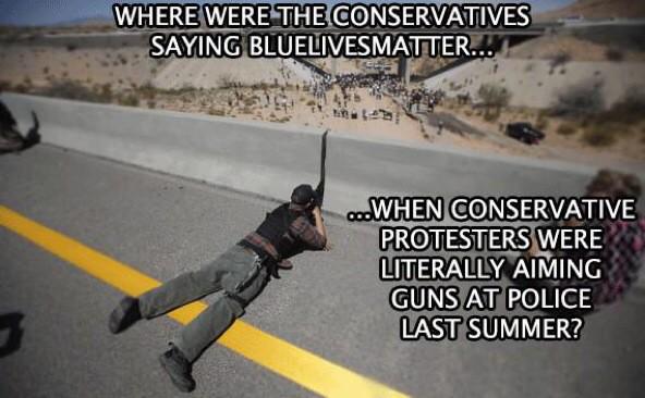 So we’ve learned that when a white, conservative rancher’s family and supporters in Nevada resist arrest and threaten government agents over land they haven’t paid grazing fees for in decades, it’s the government allegedly overstepping their boundaries. When right-wing, anti-government types kill innocent police officers, they’re completely ignored by conservative media as Media Matters pointed out.